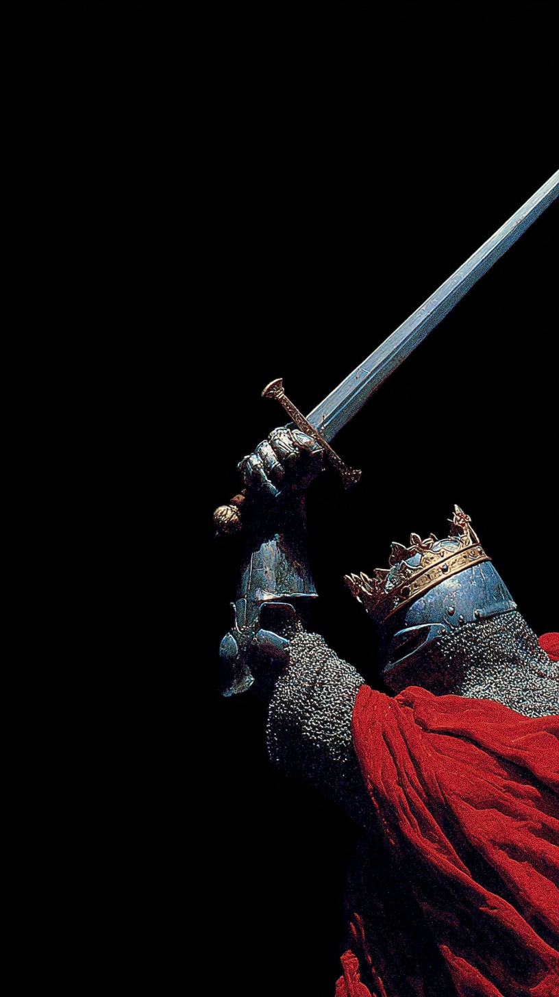 Create an image with a dramatically lit, stylized depiction of a medieval knight in full armor, victorious and holding a gleaming sword aloft. The knight wears a tarnished gold crown and a vibrant red cape. The background is stark black, emphasizing the figure and the sword. Render the armor with intricate chainmail detail and the sword with a sharp, polished blade. Use a dramatic color palette focusing on golds, reds, and steely blues, to enhance the feeling of victory and power. The composition should be dramatic, as if capturing a pivotal moment of triumph. Use cinematic lighting, creating strong highlights and shadows that emphasize the knight's posture and the details of his armor and weaponry. Capture the essence of medieval heroism and the weight of leadership.