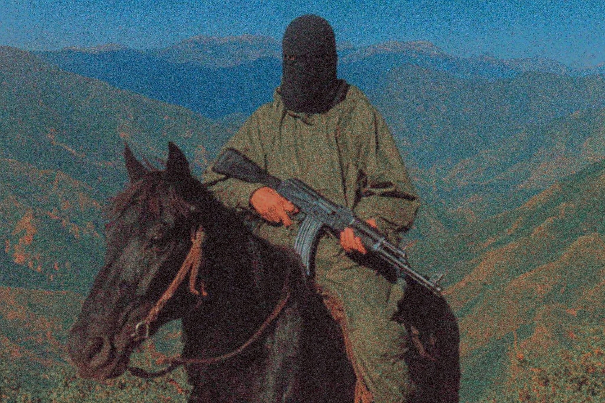 A lone figure, shrouded in a full black balaclava, sits astride a powerful black stallion, high in the rugged mountains of a remote region. The horse is muscular, with a wild mane and intelligent eyes. The rider is clad in a drab green military-style uniform, the fabric worn and weathered. He holds an AK-47 assault rifle, its metal gleaming in the diffused sunlight. The backdrop is a tapestry of blue-tinged mountains, their peaks sharp and jagged against a pale blue sky. The landscape is sparse, with only scattered vegetation clinging to the steep slopes. The overall mood is tense and watchful, as if the rider is guarding against an unseen threat. Use a cinematic lighting, depth of field, grainy film, shot on a vintage camera, realistic shadows, vivid colors, sharp focus, highly detailed, octane render, 8k resolution, photorealistic.