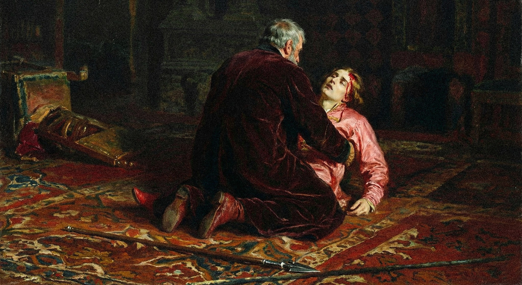 Create a highly detailed and evocative painting in the style of 19th-century academic art, depicting a tragic scene. An elderly man with a white beard, dressed in a dark maroon velvet robe, kneels beside a young woman lying on an ornate rug. The woman, wearing a pale pink silk gown, has a visible head wound with blood. Capture the raw emotion of the moment, the man's face etched with despair and grief as he cradles her. The setting is a dimly lit, opulent room with dark wood paneling and scattered artifacts. Include a fallen spear on the rug. Employ a rich color palette, with deep reds, browns, and golds dominating the scene. Focus on meticulous rendering of textures, from the velvet robe to the silk gown and the intricate patterns of the rug. The light source is subtle, emphasizing the sorrowful atmosphere. Aim for a photorealistic quality with painterly strokes. --ar 3:2 --v 5 --style expressive