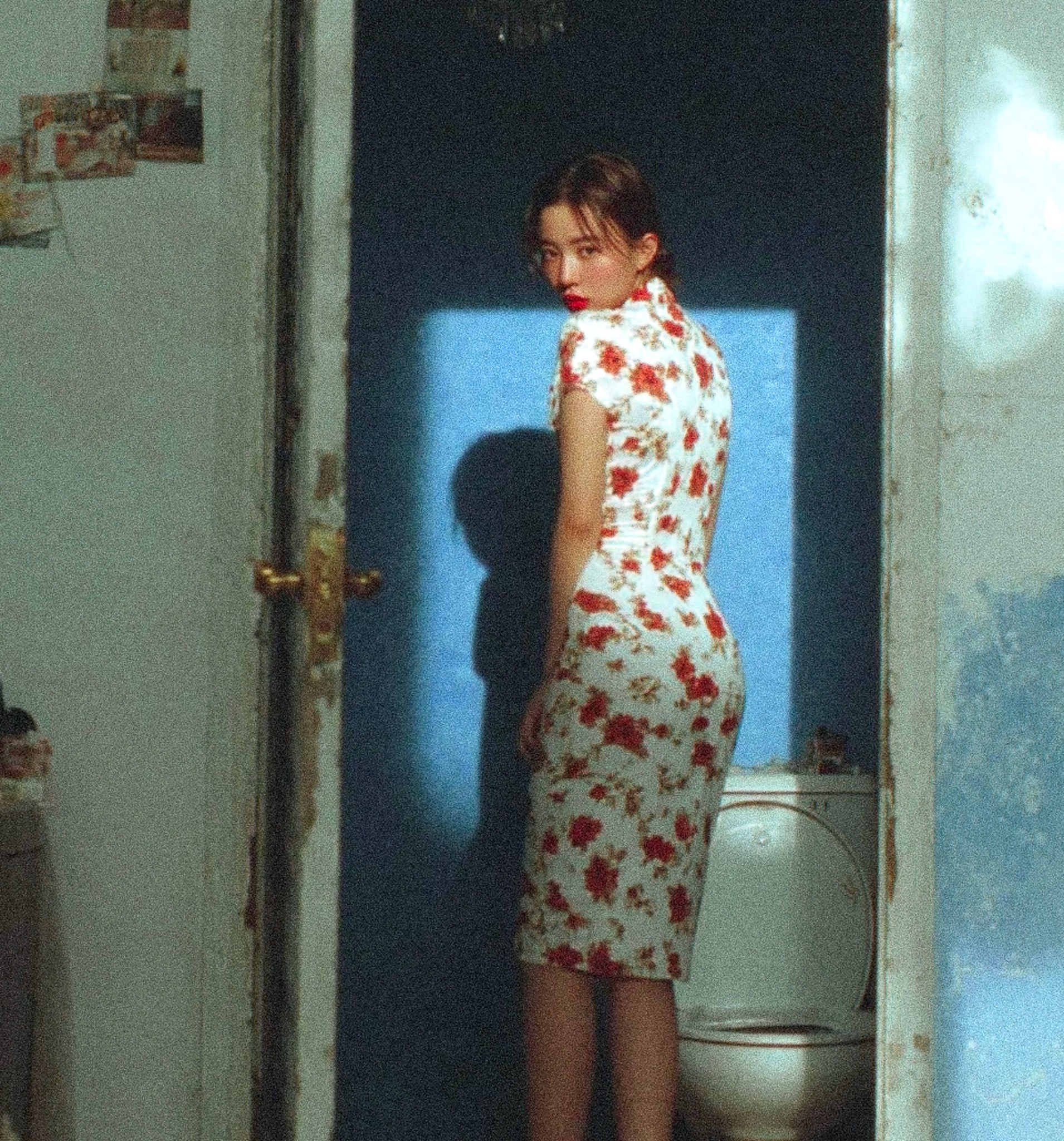 A captivating photo of a young Asian woman with red lips wearing a vintage white cheongsam dress with a delicate red floral print, standing in an old, dimly lit bathroom with chipped, faded blue walls, casting long, soft shadows, mysterious atmosphere, film grain, vintage aesthetic, focus on the woman's elegant posture and the contrast between her vibrant dress and the dilapidated environment, natural light, shot on film, medium format camera, 50mm lens, shallow depth of field, muted color palette with pops of red, reminiscent of Wong Kar-Wai's film style, captured with a touch of melancholy and nostalgia, slight vignetting, enhance the texture of the walls and the dress, add subtle dust particles in the air, evoke a sense of timeless beauty and quiet contemplation.