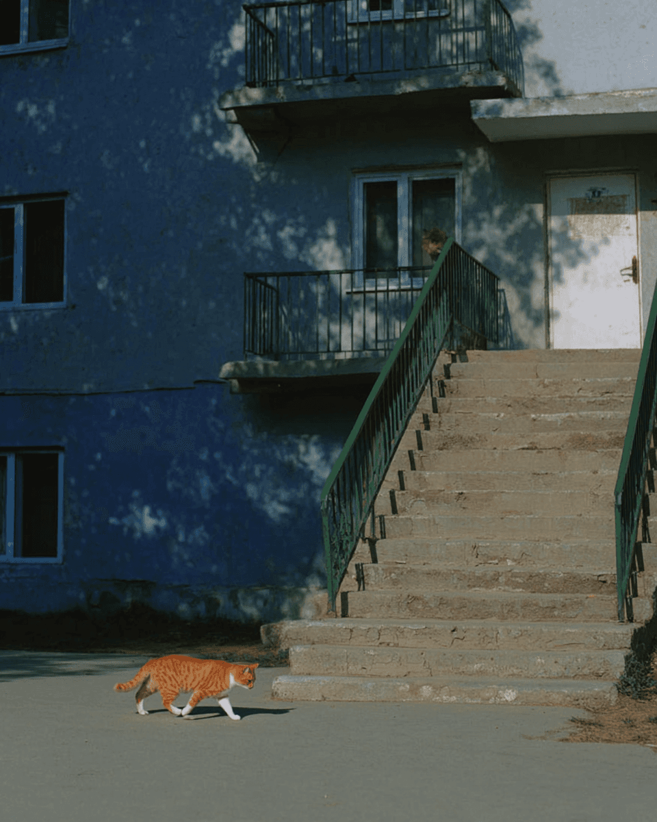 A wide-angle, slightly low-angle shot of an orange tabby cat walking across a gray concrete expanse. Behind the cat, are aged concrete stairs leading to an apartment building entrance. The building is a faded blue or gray, with balconies featuring dark green railings. Tree shadows dapple the building's facade. The lighting is stark, casting deep shadows and highlighting textures. The composition emphasizes the cat's movement and its interaction with the urban environment. Shot on film, grainy, realistic, natural light, vivid colors, environmental portrait, detailed textures, medium depth of field, by Magnum photographer, early morning light, f/5.6, 50mm lens, ISO 200.