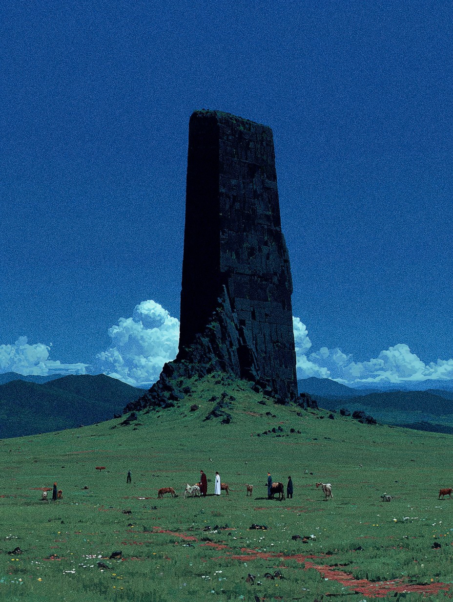 epic landscape photography, a colossal monolith rises from a rolling green plain, dark stone texture, weathered surface, its form stark against a clear blue sky dotted with fluffy cumulus clouds, foreground features a group of nomadic figures in simple robes tending to their horses and cattle, sense of scale is immense, rendering style reminiscent of Ansel Adams, capturing both the vastness of the landscape and the intimate details of the nomadic lifestyle, detailed textures in the grass, stone, and clothing, rim light to highlight the edges of the monolith and figures, dynamic composition, focus on depth of field to create a sense of distance, lens flare, hyper-realistic, 8k resolution, shot on medium format camera, wide-angle lens for expansive view, golden hour lighting.