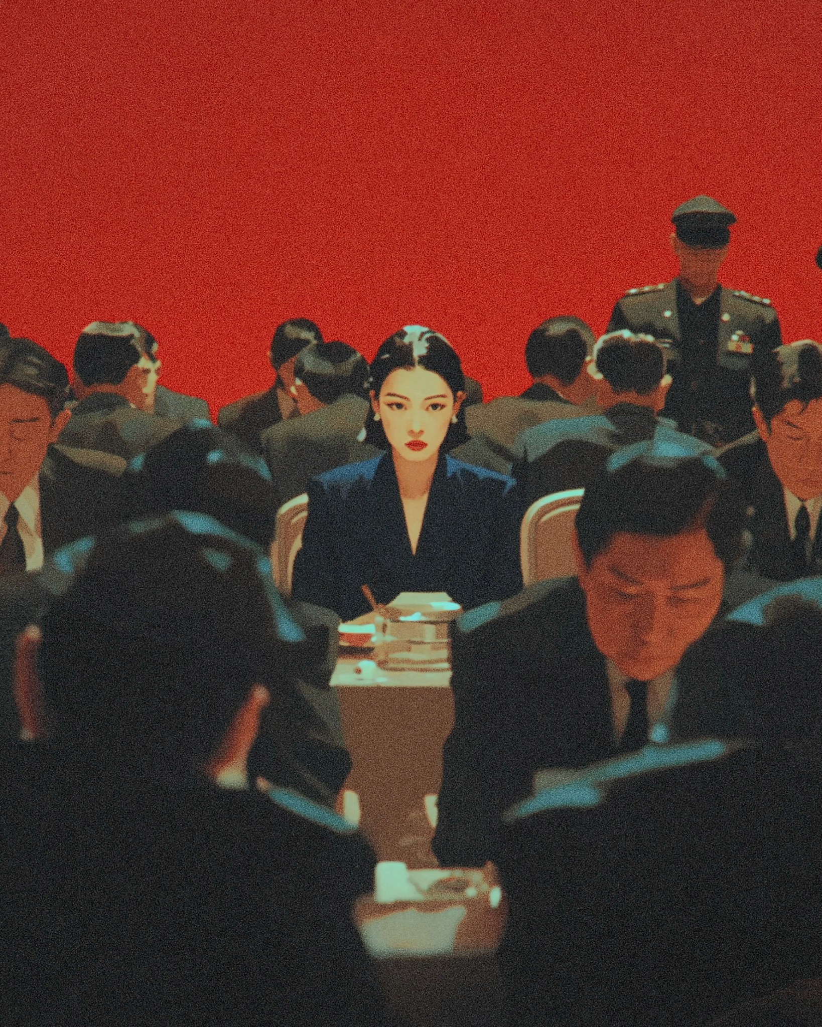 ultra realistic painting, boardroom meeting, intense atmosphere, stark red background, a single woman in a dark suit surrounded by men in black suits, a soldier stands in the background, stern expression, cinematic lighting, high contrast, deep shadows, detailed faces, oil painting style, dramatic composition, sharp focus, hyperrealism, art by Greg Rutkowski and Alphonse Mucha, 8k resolution, octane render, volumetric lighting, post-processing, color grading, photorealistic details, high quality, intricate details, sharp focus, dramatic lighting, hyperrealistic textures, atmospheric perspective, trending on Artstation