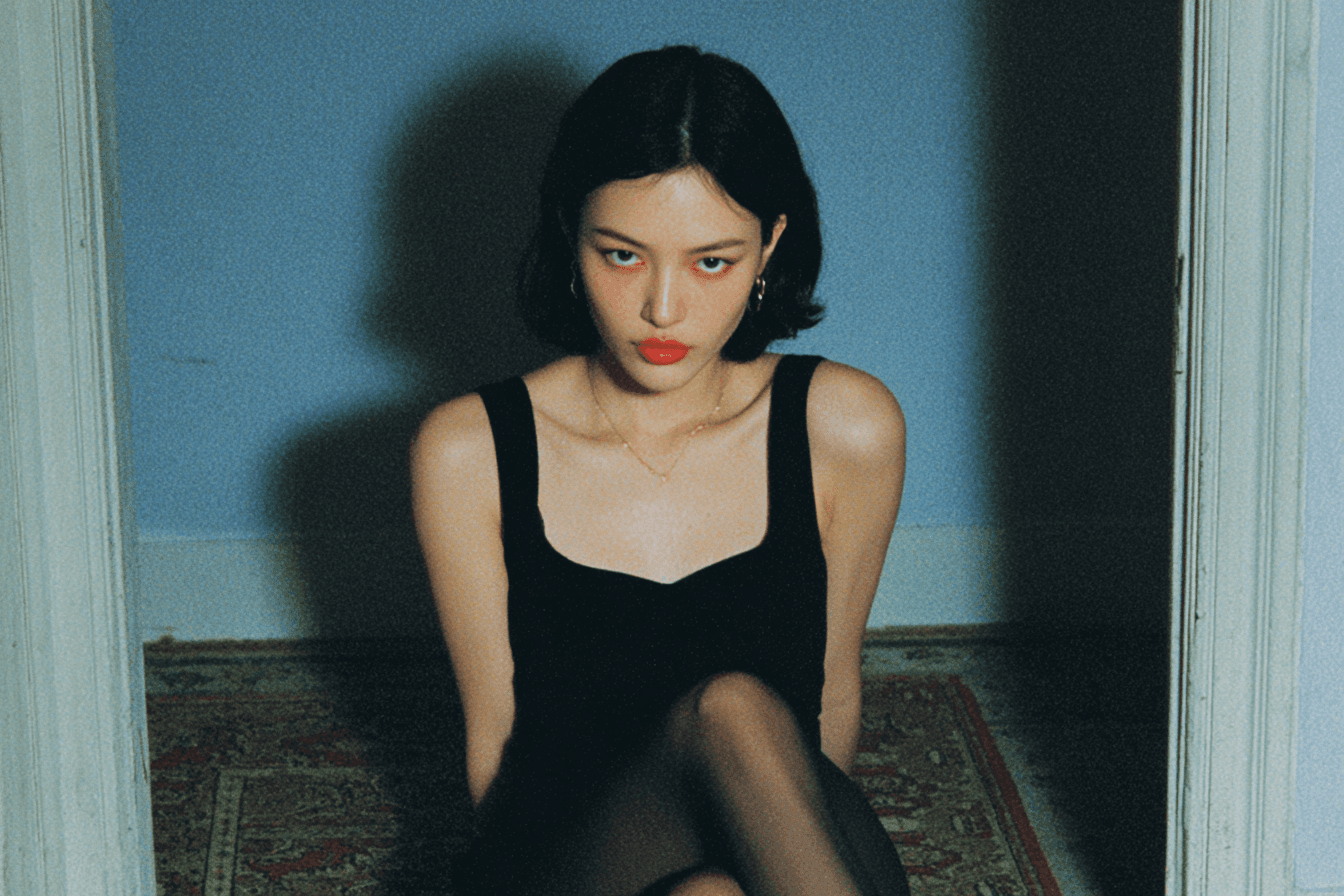 A captivating portrait of a young woman with short black hair, intense red lipstick, and striking orange eyeshadow, wearing a black dress with a subtle gold necklace, seated indoors on an oriental rug, framed by a doorway, soft diffused lighting, creating a moody and intimate atmosphere, shot on medium format film, Kodak Portra 400, shallow depth of field, cinematic composition, focus on the subject's face, subtle grain, vintage aesthetic, evoking feelings of nostalgia and melancholy, soft shadows, natural skin tones, minimalist background with a muted blue wall, capturing her piercing gaze and unique style, by Gregory Crewdson, in the style of Petra Collins.