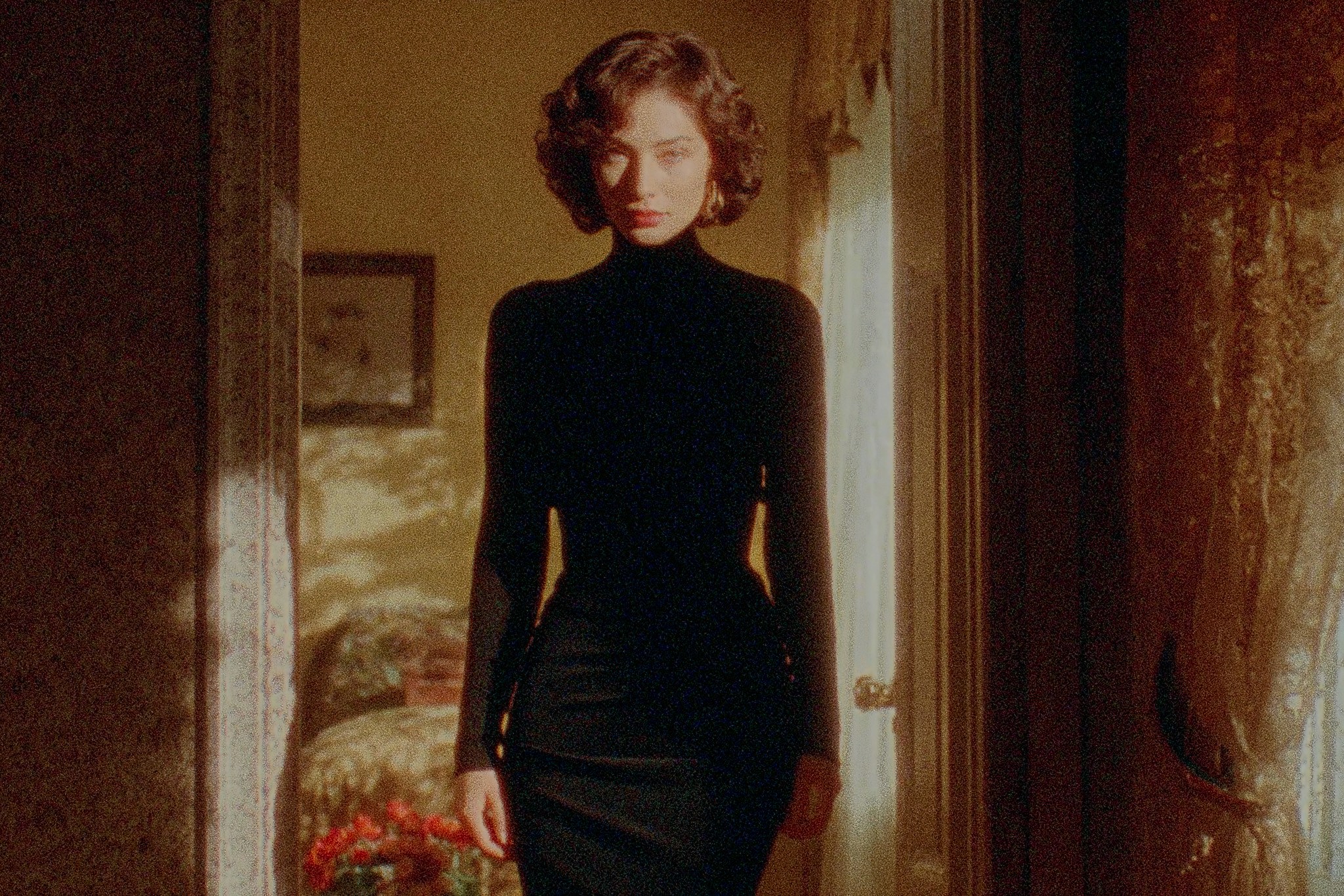A cinematic portrait of a beautiful woman with elegantly styled curly brunette hair, wearing a black turtleneck dress, full shot, standing in a doorway, bathed in golden hour sunlight, interior setting, ornate vintage curtains, soft focus background with hints of vintage furniture and flowers, high-resolution, 8k, golden hour lighting, film grain, cinematic composition, vintage aesthetic, detailed facial features, dramatic lighting, reminiscent of classic Hollywood portraits, inspired by the works of Greg Williams, shot on a Hasselblad camera with a 80mm lens, f/2.8 aperture, ISO 100, warm color palette, Vermeer lighting, golden highlights, soft shadows, natural skin texture, enhanced depth of field, volumetric lighting, ambient light, rim lighting, cinematic grade, color graded, photorealistic
