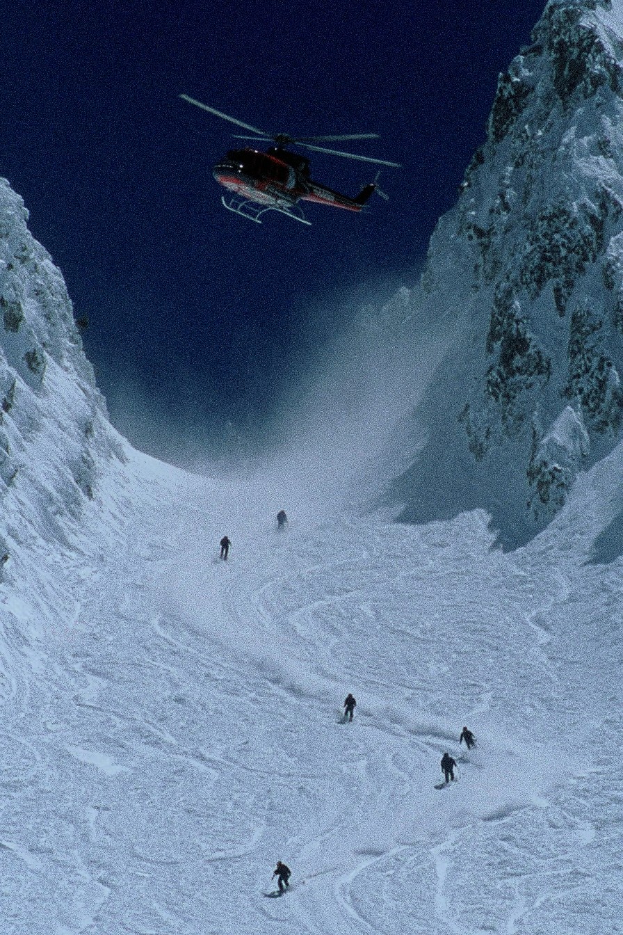 A breathtaking, high-angle photograph captures a group of skiers carving down a steep, snow-covered mountain in the Alps. A helicopter hovers above, having just dropped them off for their descent. The snow is pristine, with visible tracks left by the skiers. The mountain slopes are surrounded by jagged, rocky peaks, partially covered in snow. The sky is a deep, clear blue, contrasting with the white snow. The skiers are dressed in colorful ski gear, adding a pop of color to the scene. The scene evokes a sense of adventure, freedom, and the thrill of extreme sports. The image should be highly detailed, with sharp focus and a wide dynamic range. Use natural lighting to enhance the textures of the snow and rock. --ar 3:2 --zoom 0.8 --v 5
