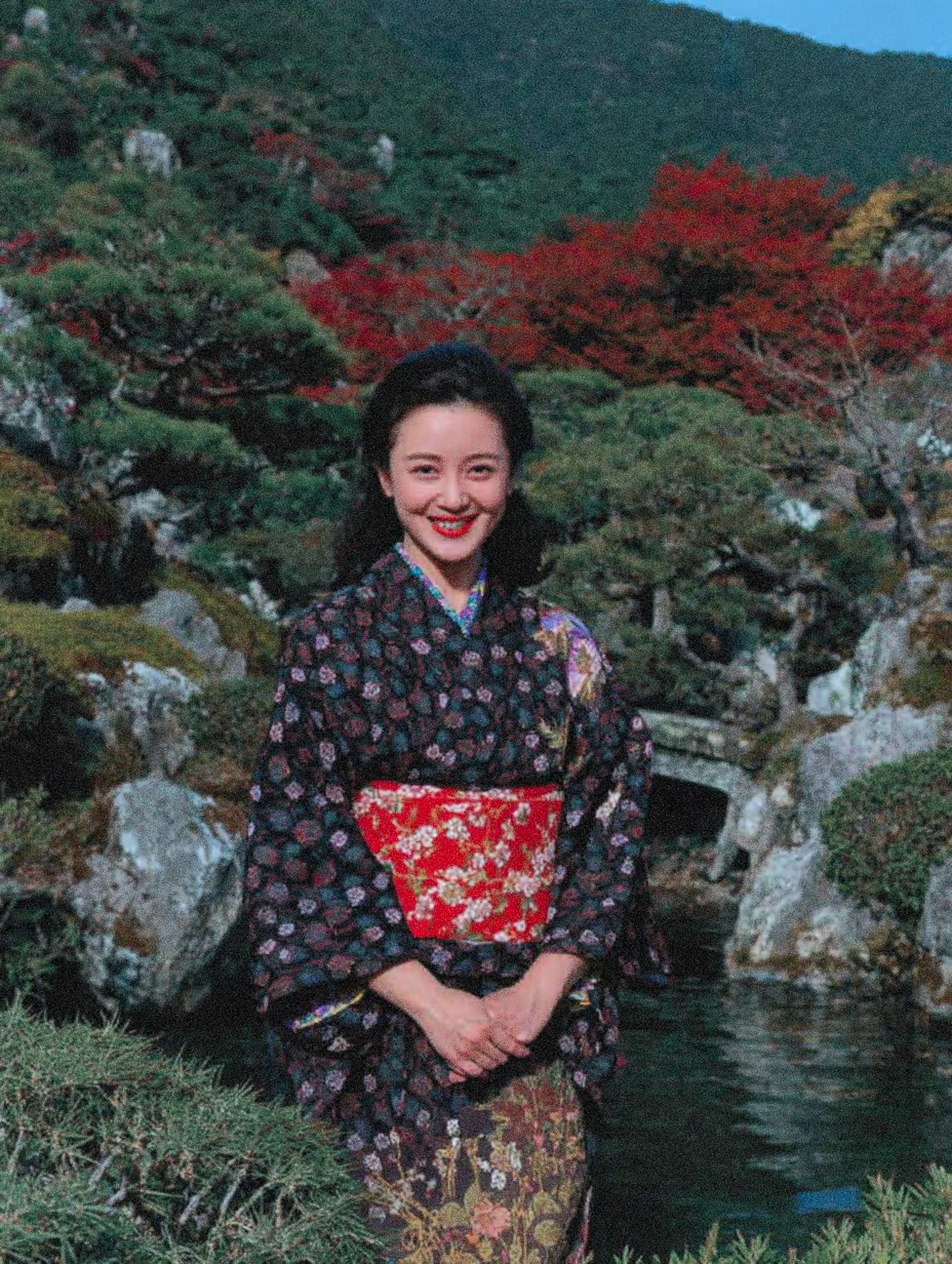 A stunning portrait of a serene woman in a traditional Japanese kimono, standing gracefully in a lush Japanese garden. The kimono is intricately patterned with floral designs, complemented by a vibrant red obi. The garden features meticulously manicured trees, moss-covered rocks, and a tranquil pond reflecting the surrounding landscape. In the background, vibrant autumn foliage adds a splash of color. The scene is bathed in soft, diffused sunlight, highlighting the woman's radiant smile. The photograph captures a sense of peace, tradition, and timeless beauty. Shot with a Sony Alpha camera, 85mm lens, f/2.8 aperture, ISO 200, 1/160 shutter speed. --ar 2:3 --v 5 --style expressive