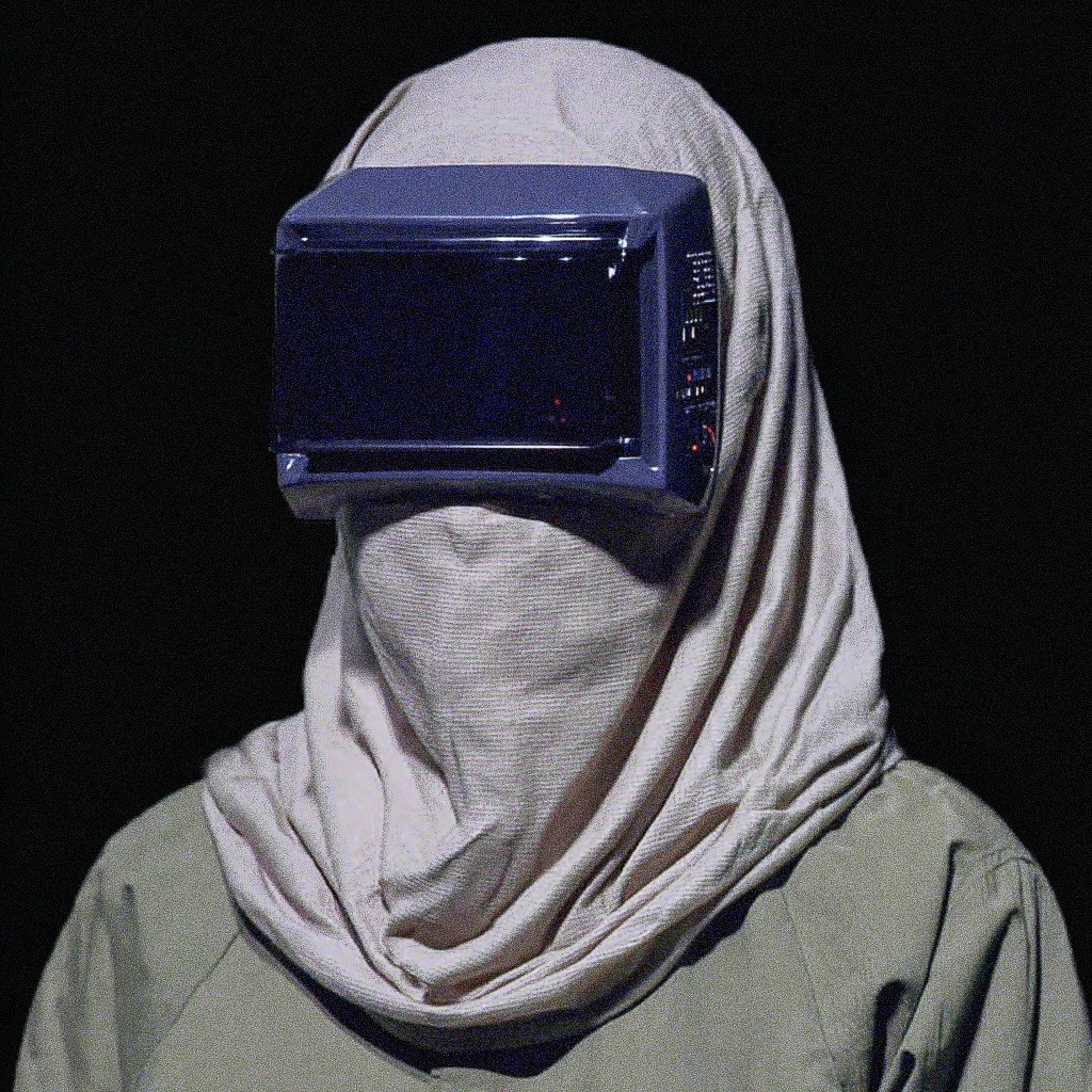 A person with a microwave oven obscuring their head, creating a futuristic and unsettling figure, head wrapped in light beige fabric, similar to a cowl or hood, olive green clothing, dark ominous shadows and background, the microwave is an older model with visible buttons and dials, stark lighting highlighting the contours of the fabric and the metallic surface of the microwave, a juxtaposition of soft textile and hard technology, grainy texture, a sense of isolation and anonymity, subtle contrast, digital art, hyperrealistic details, uncanny valley vibes, muted color palette, high resolution, intricate textures, a modern yet slightly retro aesthetic, studio lighting, dramatic mood, conceptual photography, art piece, focus on texture and form.