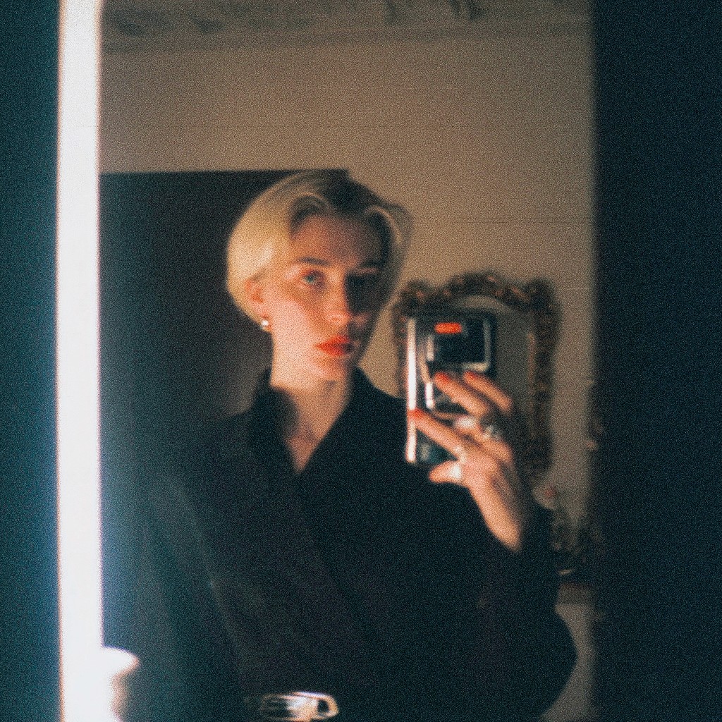 A vintage-style selfie featuring a woman with short blonde hair and bright red lipstick, reflected in a mirror with an ornate frame. The image has a grainy texture, reminiscent of film photography.