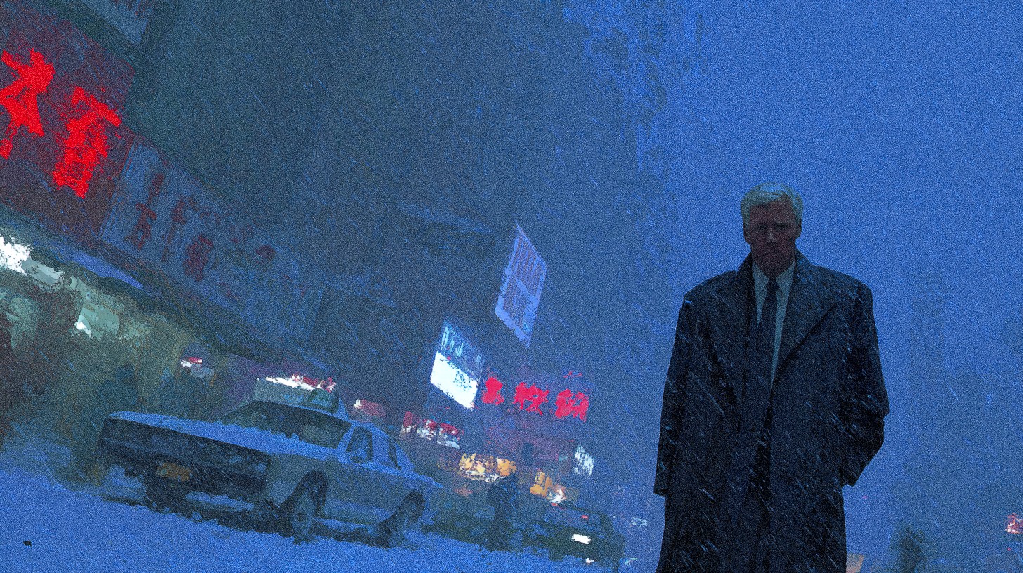 A digital painting evoking the atmosphere of Blade Runner, featuring a solitary figure standing in a snow-covered cityscape. The scene is illuminated by a hazy blue light, punctuated by the vibrant, blurry glow of neon signs in Kanji, reflected on the wet, snow-covered streets. The figure is dressed in a dark trench coat, with a somber expression, his features cast in shadow. Police cars with flashing lights are partially visible in the background, adding to the sense of urban decay and technological advancement. The style is reminiscent of Syd Mead, with a focus on moody lighting, atmospheric depth and textured surfaces. Ultra-detailed, photorealistic, 8k resolution, octane render, volumetric lighting, subsurface scattering, film grain.