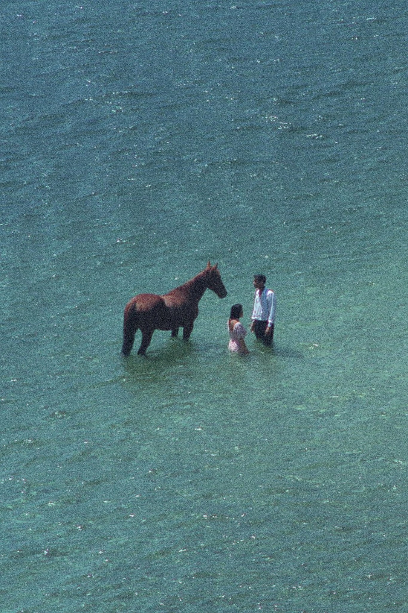 A cinematic still, horse standing in shallow turquoise water, waist deep, next to a standing couple, the water stretches to the horizon, soft sunlight, ethereal quality, shot on 70mm, vibrant color palette, shallow depth of field, dreamy and melancholic atmosphere, focus on the connection between the figures and the ocean, detailed and textured, creating a sense of intimacy and wonder, high resolution, award-winning photography, realistic but with a touch of fantasy, trending on artstation, inspired by surrealism and nature photography, soft shadows, natural lighting, horse is chestnut brown, clothing is simple and elegant, cinematic composition, wide shot, capturing the vastness of the sea, soft focus background, golden hour lighting, depth of field --ar 3:2 --v 5 --style scenic