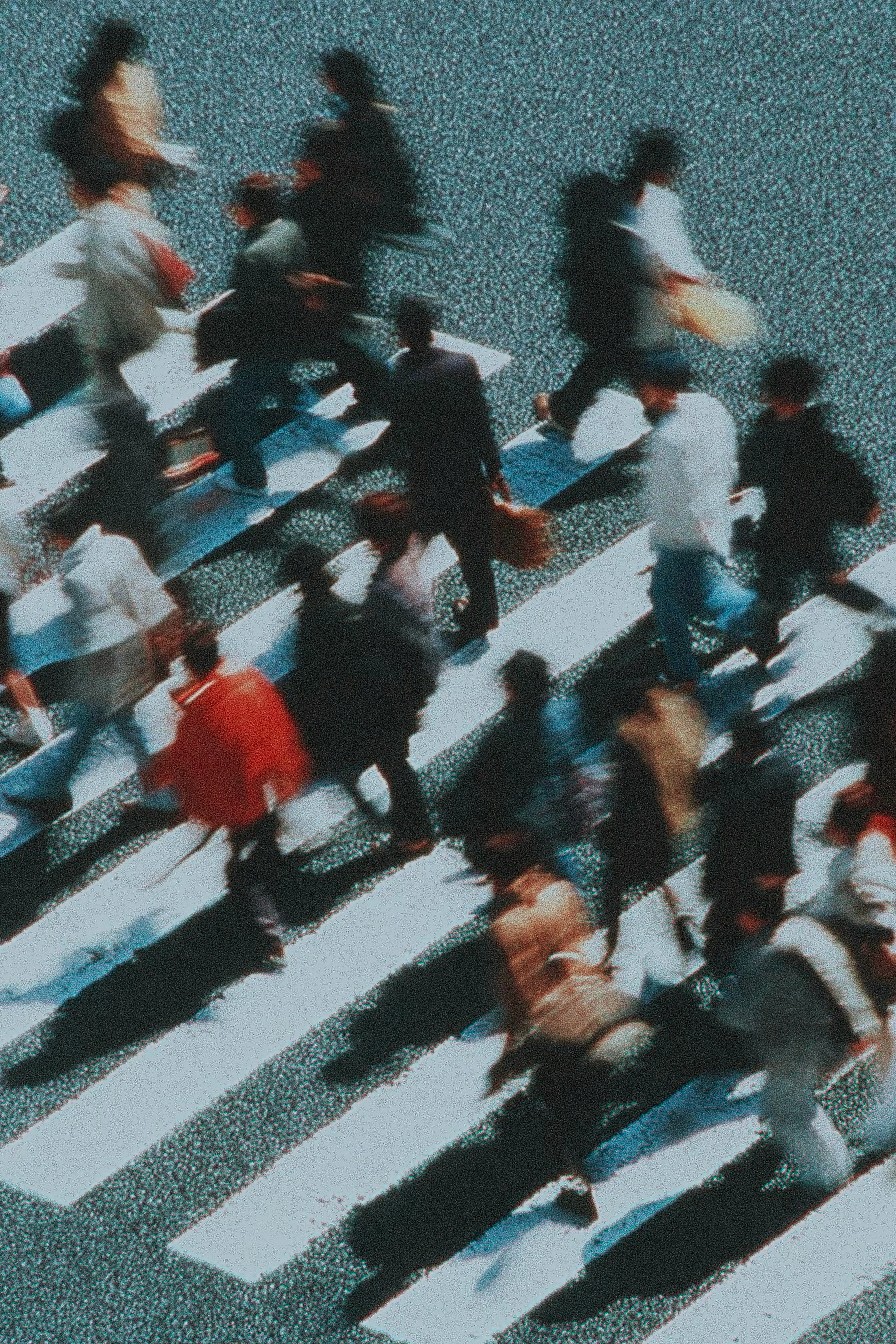 High angle shot, blurred motion, crowd of people crossing a zebra crosswalk, urban setting, daytime, artistic photography, grain, soft lighting, shallow depth of field, street scene, impressionistic, candid, anonymous figures, desaturated colors, teal and white palette, diagonal composition, photojournalism, visual metaphor for city life, film photography aesthetic, 35mm lens, street photography, gritty texture, dynamic movement, urban exploration, bustling atmosphere, candid moments, everyday life, anonymity, city dwellers, transient existence, blurred reality, urban dreamscape, fleeting moments, human traffic, urban rhythm, abstract expressionism, fine art photography, timeless quality, cinematic feel, captured in motion.