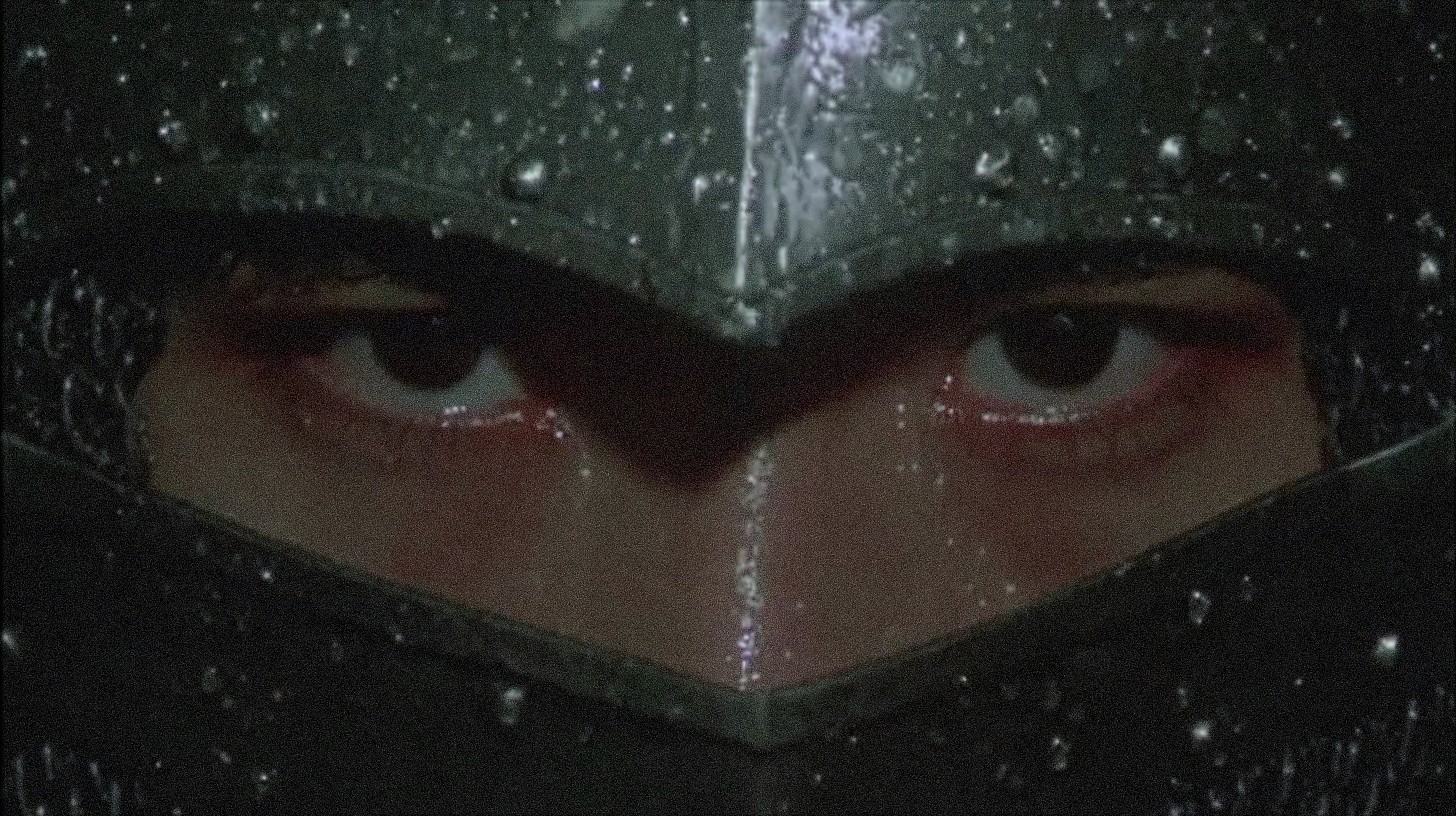 Extreme close-up of a knight's face, focusing solely on their eyes peeking out from beneath a dark, steel helmet covered in raindrops. The background is black and out of focus. The eyes are the focal point, showcasing intensity, determination, and a hint of sadness. The helmet is detailed with visible scratches and wear, giving a sense of battle-hardened experience. The raindrops glisten under faint light, creating a somber mood. Use dramatic lighting to emphasize the texture of the armor and the depth of the eyes. The overall feel should be gritty, realistic, and slightly melancholic. cinematic, 8k, photorealistic