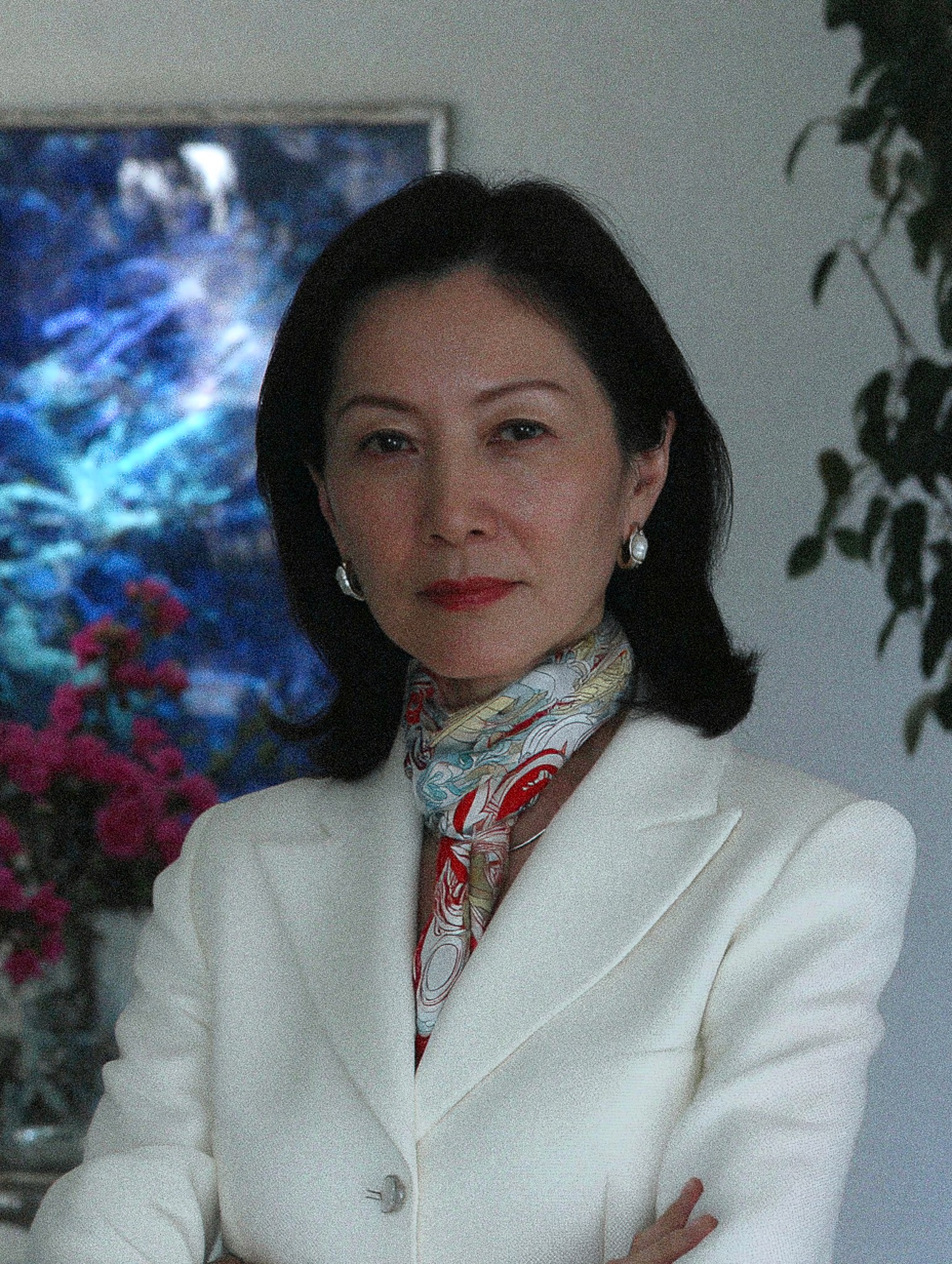 A medium shot portrait of an elegant Asian woman in her late 40s, wearing a crisp white business suit and a stylish silk scarf with intricate patterns, against a blurred background featuring an abstract painting with splashes of blue and pink hues and a hint of greenery from a potted plant. The woman has short, dark hair and wears pearl earrings. Her makeup is subtle but elegant, with a focus on red lipstick. The light is soft and diffused, highlighting her features and giving the image a timeless quality. She has a composed and confident expression, arms folded, suggesting professionalism and authority. Camera: Hasselblad, Lens: 80mm, Aperture: f/2.8, Shutter Speed: 1/125, ISO: 100, cinematic lighting, award-winning photography, ultra-realistic, 8k