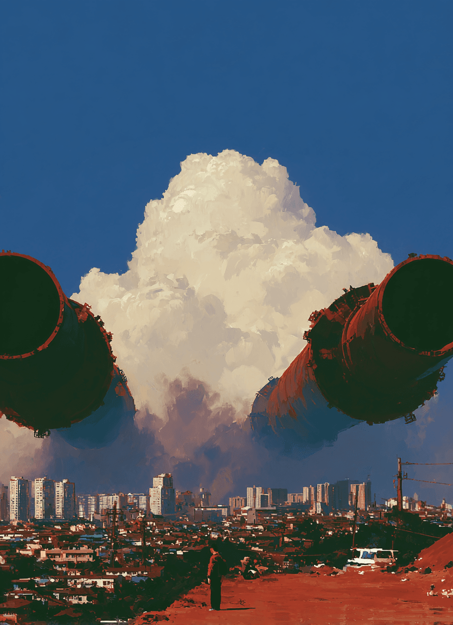 A breathtaking view of a sprawling city from a high vantage point, but with a surreal twist. Dominating the skyline are two enormous, rusty, industrial pipes that seem to float in the sky, their scale dwarfing the buildings below. A gigantic, fluffy white cloud billows between and behind them, adding to the otherworldly atmosphere. In the foreground, a lone figure stands on a reddish-brown, slightly barren hill, gazing up at the scene with wonder. The city itself is a mix of high-rise apartments and smaller houses, creating a sense of depth and scale. The sky is a clear, vibrant blue, providing a stark contrast to the rusty pipes and the bright white cloud. The overall effect is both awe-inspiring and slightly unsettling, a reminder of the power and strangeness of the human imagination. Use a vibrant color palette, sharp details, and dynamic lighting to bring this surreal cityscape to life.