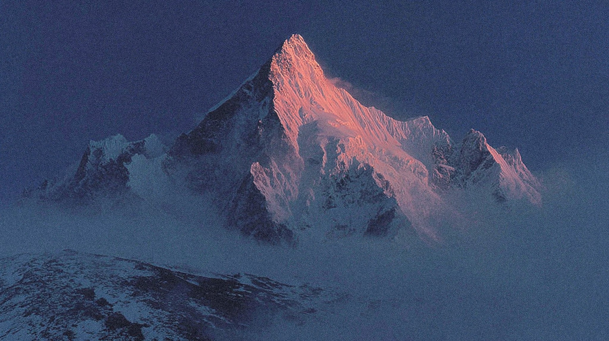 Epic cinematic shot of a towering mountain peak at sunset, snow-covered and majestic, bathed in warm, golden light. The foreground features a swirling mist and fog, creating a dramatic and mysterious atmosphere. Sharp focus, hyper-detailed, realistic textures of snow and rock. The sky is a gradient of deep blues and oranges. Rendered in 8k resolution, volumetric lighting, intricate details, dramatic composition, shot on Hasselblad X1D, f/8, ISO 100, 1/250s. Style of Ansel Adams, with the color palette of Albert Bierstadt, showcasing the raw beauty and grandeur of nature. Capture the sense of awe and wonder, emphasizing the scale and power of the natural world. --ar 3:2 --v 5 --zoom 0.8