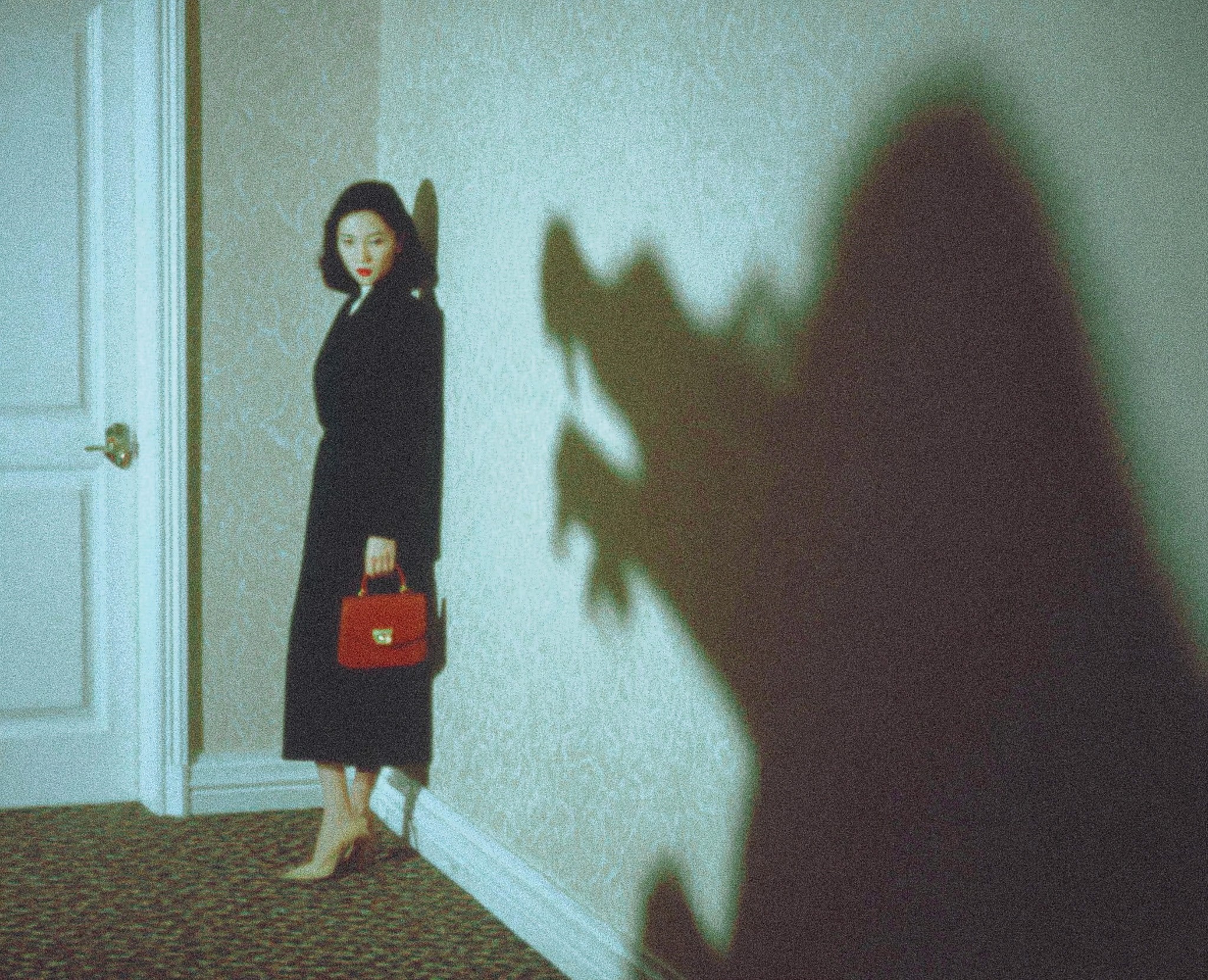 A cinematic still. A slender woman in a 1940s style black dress stands against a textured wall in a dimly lit hallway. She holds a red handbag. A large, menacing shadow stretches behind her. Dramatic lighting. Film noir style. Dark and mysterious atmosphere. Moody. Grainy film. Sharp focus on the woman, blurred background. Use a vintage color palette. --ar 3:2 --zoom 1.2 --v 5 --style expressive