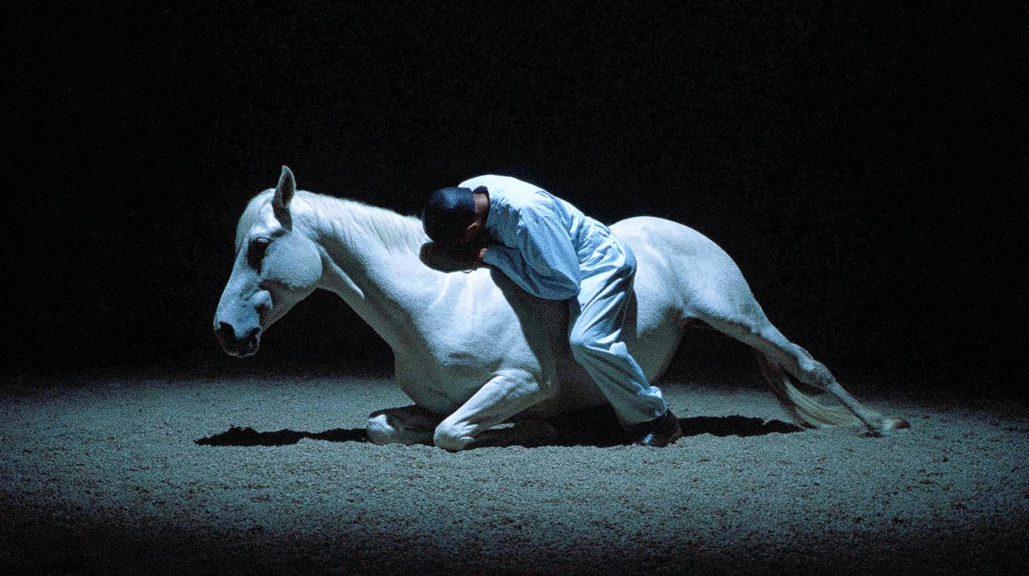 A captivating and emotionally resonant photograph, a lone man, dressed in simple, flowing white clothes, resting his head against the side of a magnificent white horse. The horse is lying down in a bed of sand, with the man kneeling beside it, illuminated by a single, dramatic spotlight. The background is a deep, dark abyss, emphasizing the intimacy and bond between the man and the horse. The composition is dramatic and cinematic, evoking a sense of peace, comfort, and understanding. Capture the softness of the horse's coat, the gentle curves of its body, and the quiet connection between the two figures. High resolution, detailed textures, soft lighting, emotional depth, cinematic composition, ultra realistic.