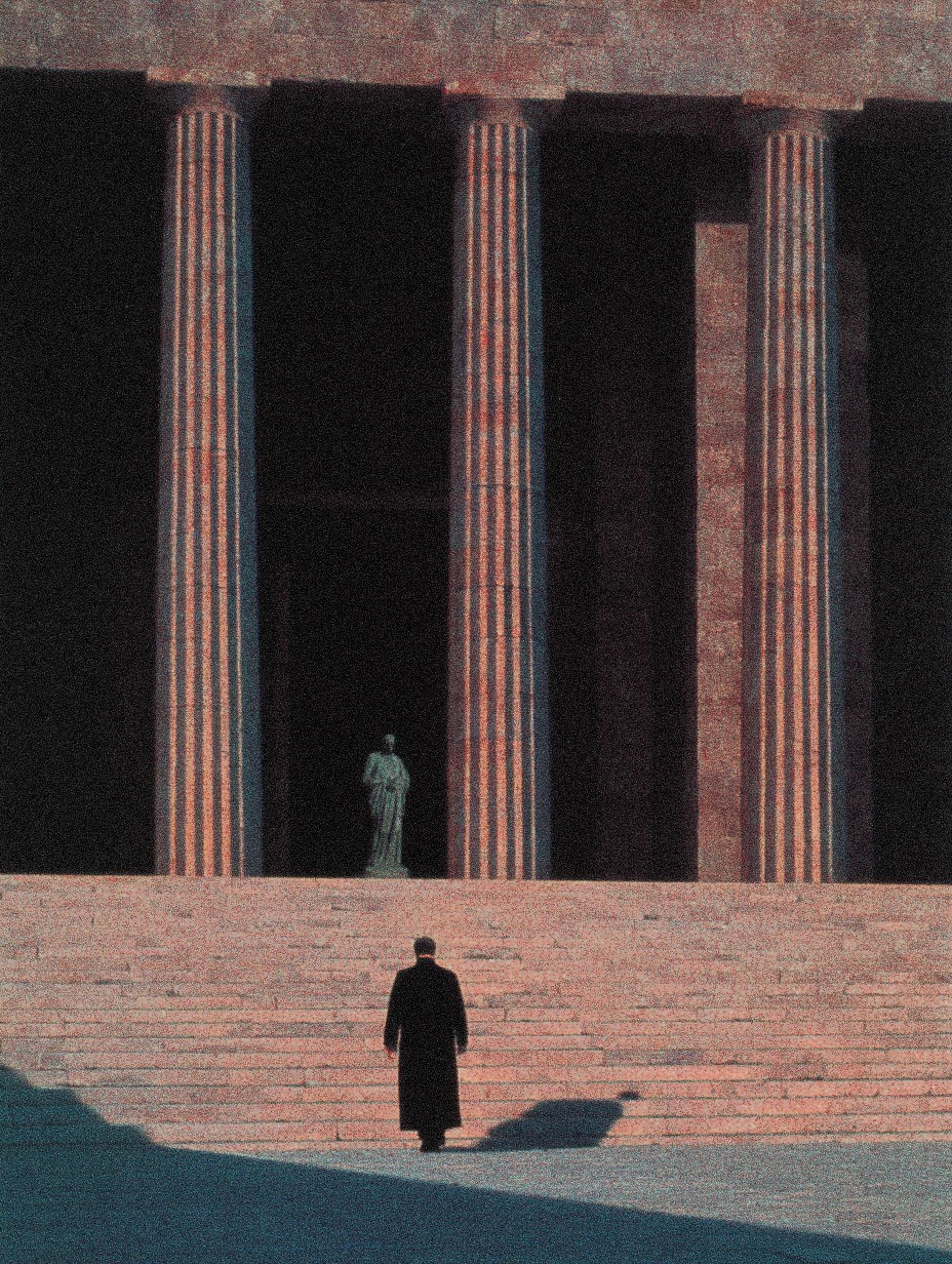 A solitary figure in a dark coat walks up stone steps toward a grand building. Tall, fluted columns bathed in warm sunlight frame a dark entrance. Inside, a classical statue stands silhouetted. The scene is rendered with a slightly grainy texture and a desaturated color palette. Capture the mood of isolation and quiet grandeur. Inspired by the works of Gregory Crewdson and early 20th-century architecture photography. Use a wide angle lens to emphasize the height of the columns. Add a soft, diffused light to highlight the textures of the stone. The composition should draw the viewer's eye towards the statue in the background, creating a sense of mystery and anticipation. Incorporate shadows that stretch across the steps, further emphasizing the feeling of solitude.