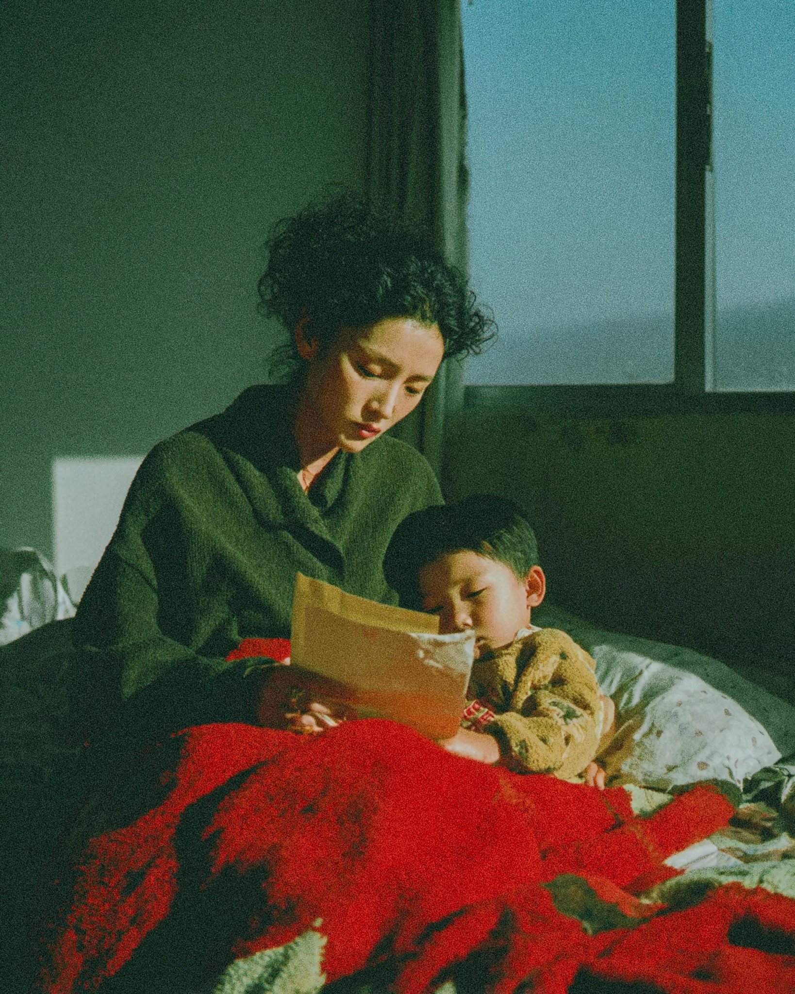 A captivating photo of a mother and her young child reading a book together on a cozy bed, soft natural light filtering through a nearby window, casting gentle shadows. The mother, with her curly hair, wears a dark green jacket and is focused on the story. The child, dressed in a yellow sweater, snuggles close. A vibrant red blanket adds warmth to the scene. The composition is intimate and captures the bond between mother and child, evoking feelings of warmth, love, and tranquility. Use a cinematic approach with a shallow depth of field, emphasizing the subjects and blurring the background, hyperrealistic, detailed texture, 8k, trending on artstation, photorealistic, Fujifilm XT-4, f/2.8, ISO 200