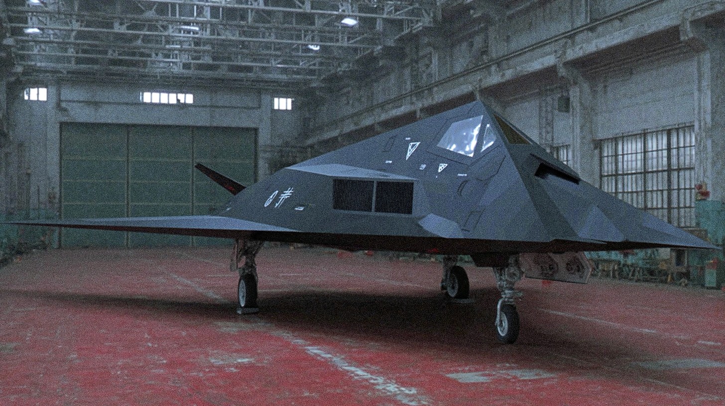 A F-117 Nighthawk stealth attack aircraft, inside a large, dimly lit aircraft hangar. The hangar features aged concrete walls, a high ceiling with exposed metal beams, and large metal doors, some closed and others open slightly revealing the outside world. The aircraft is matte black with sharp, angular lines and a unique stealth design. The floor is red painted concrete with visible wear and tear, showing signs of years of use. Soft, diffused lighting creates shadows and highlights on the aircraft and hangar surfaces, emphasizing the size and age of the space. The overall mood is one of subdued power and mystery, with a touch of nostalgia for the Cold War era. cinematic, 8k, photorealistic --ar 16:9