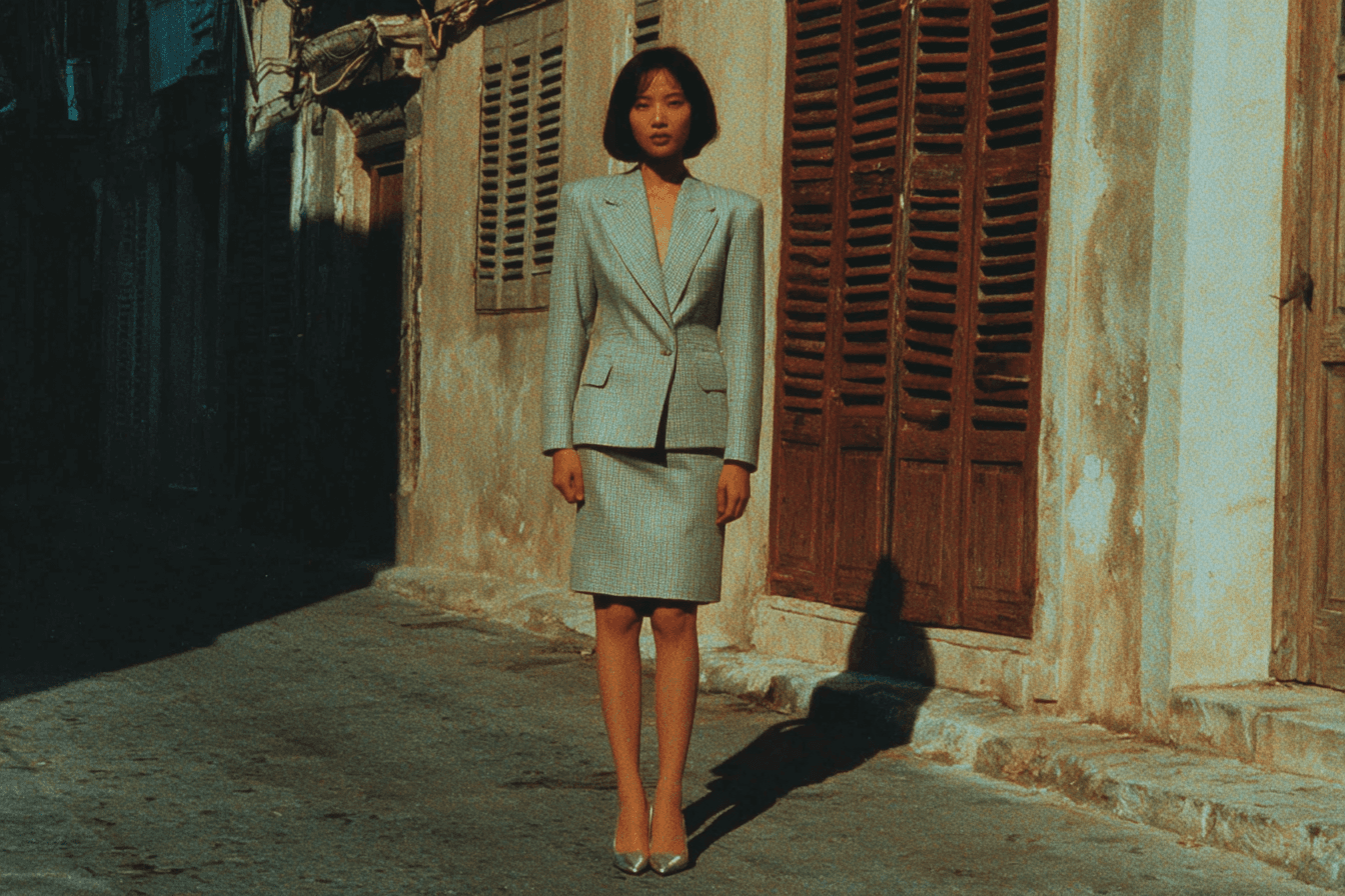 A captivating full shot of a stylish Asian woman standing on a sun-drenched street in an old city. The woman is dressed in a well-tailored gray suit, a skirt and jacket combo, paired with silver heels. Her short, dark hair is neatly styled. The background consists of weathered buildings with closed wooden shutters and a mix of sunlight and shadows playing across the textures of the aged walls. The lighting emphasizes the subject and the architectural details, creating a cinematic atmosphere reminiscent of film noir. Use shallow depth of field to blur the background slightly, further emphasizing the woman. The overall mood is mysterious and sophisticated. Style: Film Noir, fashion photography. Camera: Medium format. Lens: 85mm. Lighting: Natural sunlight with dramatic shadows. Colors: Muted tones, with emphasis on grays, browns, and golds. --ar 3:2