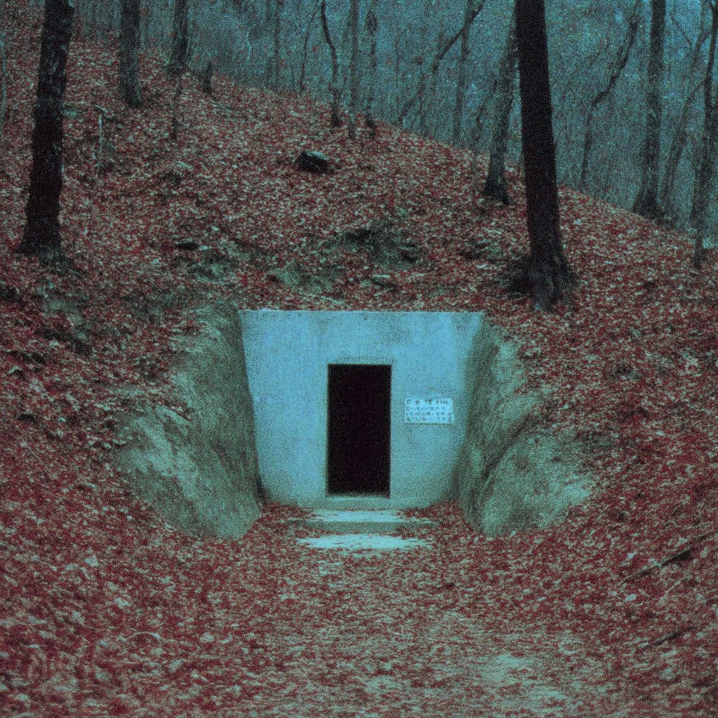 A dark and mysterious underground entrance in a dense, misty forest, autumn leaves blanketing the ground. The entrance is a concrete structure with a dark, rectangular doorway, partially hidden by the surrounding foliage. The forest is thick with tall, bare trees, their branches reaching up into the overcast sky. The light is dim and diffused, creating a sense of unease and isolation. The overall mood is eerie and unsettling. hyperrealistic rendering, detailed textures, volumetric lighting, cinematic composition, deep shadows, desaturated colors, high resolution, 8k, dramatic lighting, photorealistic, ominous atmosphere, focus stacking, shallow depth of field, film grain, muted color palette.