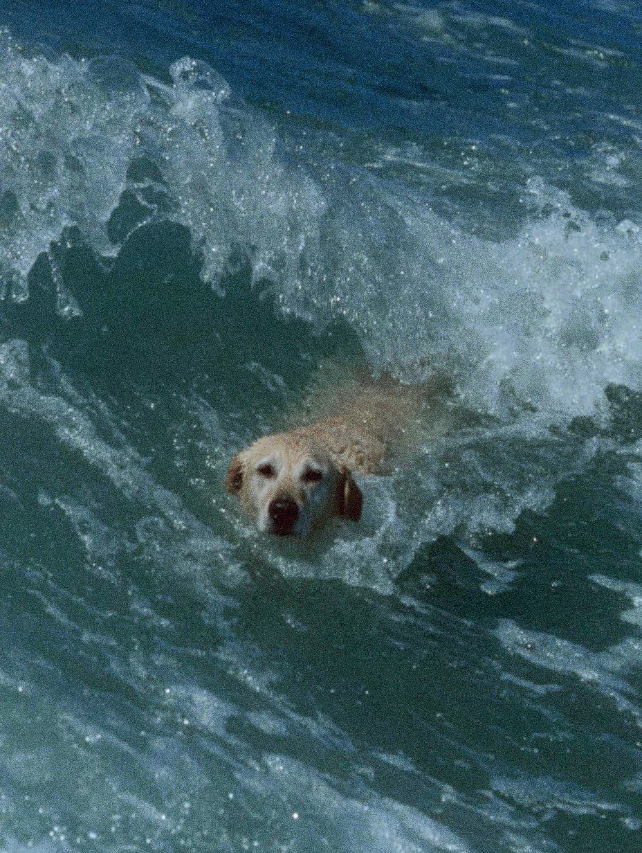 A golden labrador retriever is seen swimming vigorously through choppy ocean waves. The sun shines brightly, casting sparkling reflections on the water's surface. The dog's head is above the water, with a happy, determined expression. Waves crash around the dog, creating splashes and dynamic movement. The scene is captured with a shallow depth of field, focusing on the dog's face and the immediate water surrounding it. The overall color palette is dominated by blues and greens of the ocean, contrasted by the golden fur of the retriever. Use a cinematic style with high resolution to capture the textures of the fur and the water droplets. The perspective is slightly below the water line to emphasize the dog's interaction with the waves, digital art, detailed, hyperrealistic, vibrant, sharp focus.