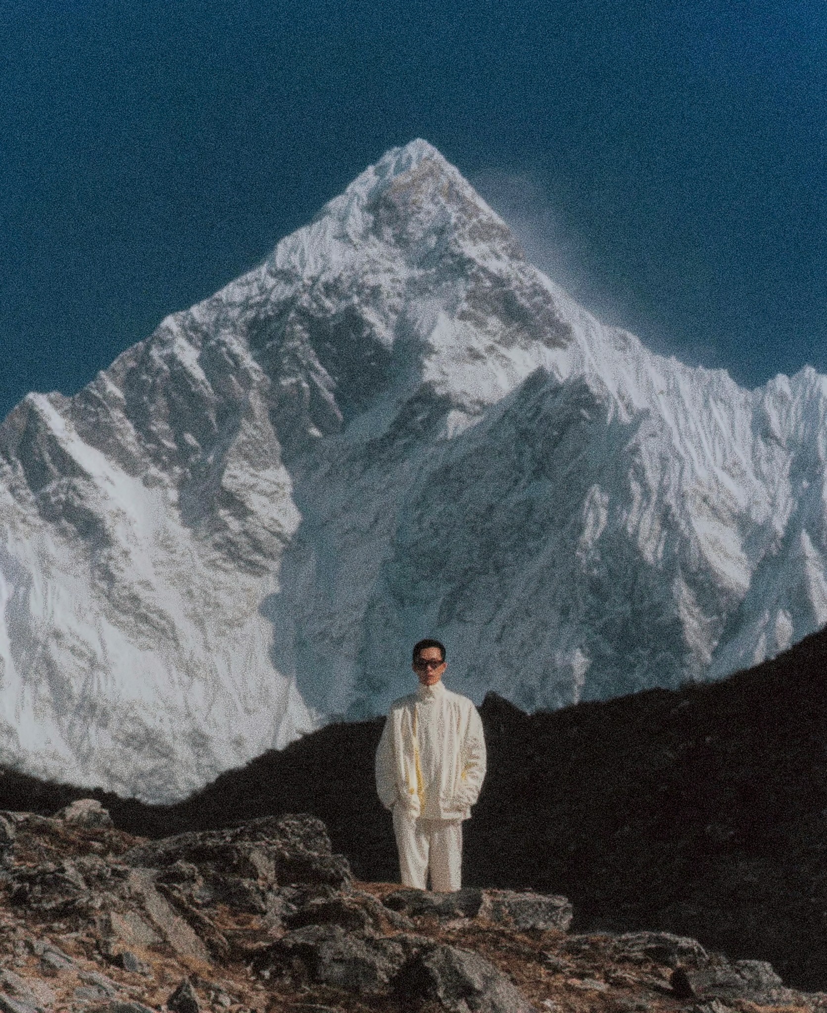 A vintage-style photograph of a mountaineer standing at the base of Mount Everest. The mountaineer is wearing a light-colored, possibly white or cream-colored suit, and sunglasses, projecting an image of calm confidence against the formidable mountain backdrop. The scene is bathed in natural light, highlighting the snow-covered peaks and the rocky terrain. The composition emphasizes the scale of the mountain compared to the figure, creating a sense of awe and human insignificance. Use a vintage filter to mimic the look of old film photography, complete with subtle grain and slightly muted colors. The sky is a clear, deep blue, contrasting beautifully with the white of the snow and the darker tones of the rocks. The overall aesthetic should evoke a sense of exploration and adventure, with a touch of retro coolness. The focal point is the mountaineer, but the grandeur of Everest dominates the background, adding depth and context to the scene.