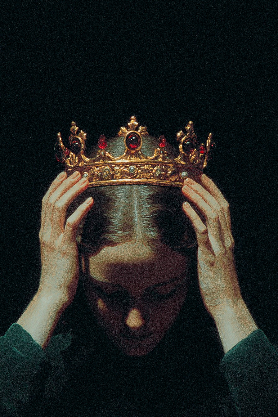 close-up portrait, young woman carefully placing a golden crown adorned with rubies on her head, dramatic lighting with strong chiaroscuro, dark background, reminiscent of classical portraiture, oil painting style, hyperrealistic details, intricate filigree on the crown, soft, diffused light highlighting the woman's face, her expression conveying a mix of determination and vulnerability, cinematic composition, deep shadows adding to the sense of mystery, fine art, volumetric lighting, masterpiece, ultra high resolution, 8k --ar 2:3 --style expressive